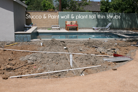 The planter wall on the side of the pool will also be filled with climbing vines on trellises to help cover up the huge wall, which is our garage. The back concrete pad was the only other concrete we had poured. Eventually chaise lounge chairs will go there. I can't wait till I'm hanging back there with a margarita in hand :)